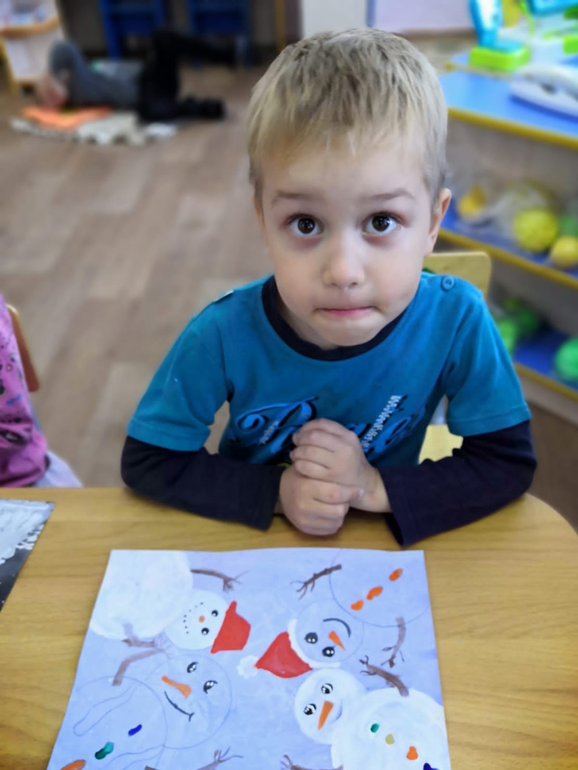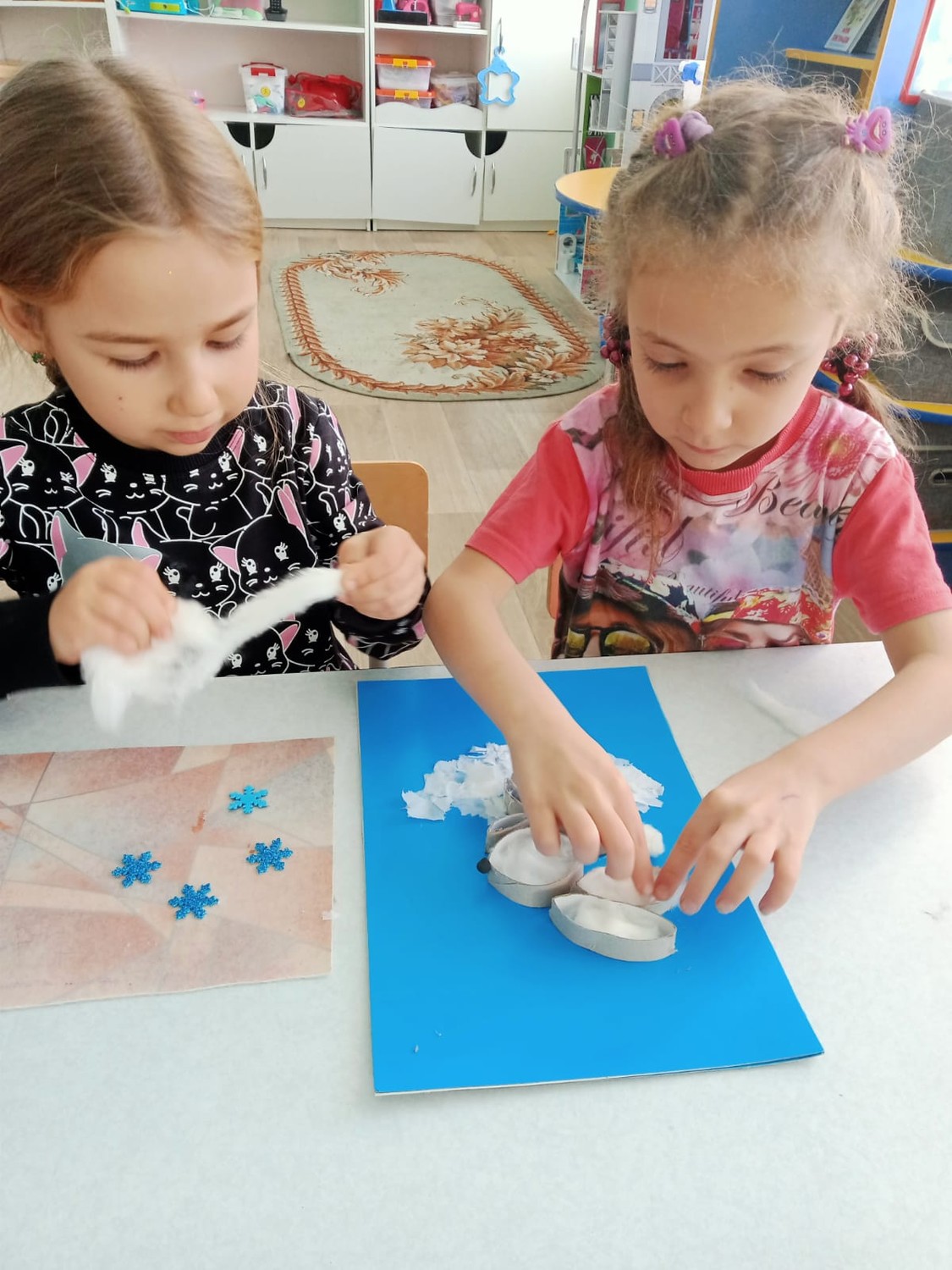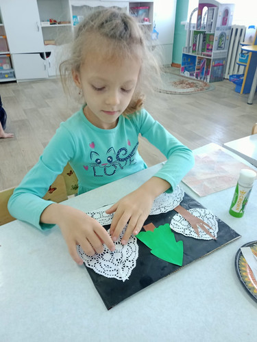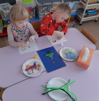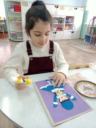 В подготовительной к школе группе дети мастерят поделки на тему: "Зимушка - красавица". Всей группой делают новогоднюю ёлку и с нетерпением ждут в гости Деда Мороза и Снегурочку.